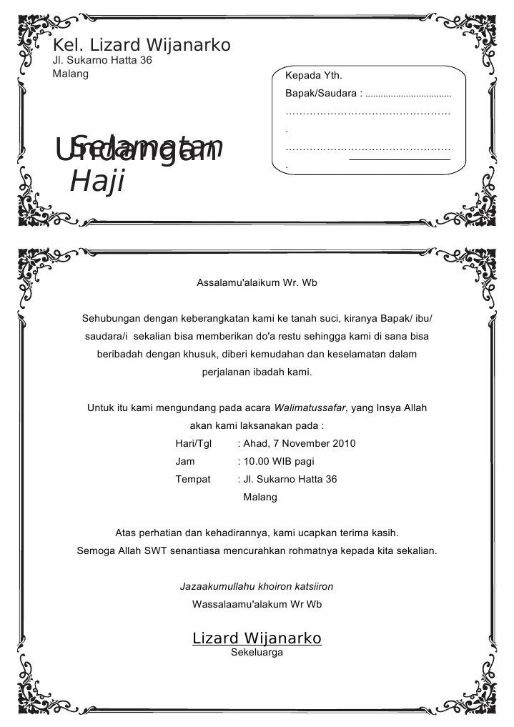 Format undangan microsoft word berikut ini kami bagikan beberapa contoh. Contoh konsep surat undangan walimatus safar umroh word. Format contoh undangan walimatul haji, tingkepan, acara rapat, semuanya bisa. Contoh surat undangan syukuran rumah baru, format word a4. Berhubung ada request tentang surat undangan walimatul khamli atau 7 bulan makan pada kesempatan yang baik ini saya memposting dan membagikannya untuk anda .